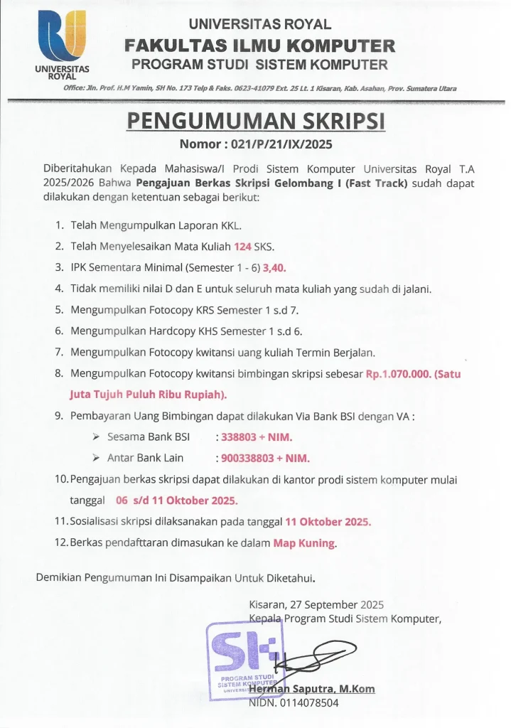 Perhatian! Pendaftaran pemberkasan Skripsi Fast Track Program Studi Sistem Komputer Universitas Royal telah dibuka. Segera persiapkan berkas Anda sesuai dengan persyaratan yang telah ditentukan. Cek jadwal dan prosedur pengumpulan melalui website ini, serta pastikan Anda memenuhi batas waktu yang ditetapkan. Informasi lebih lanjut dapat dilihat pada pengumuman berikut. Apabila terdapat pertanyaan, silakan datang langsung ke kantor Program Studi Sistem Komputer.”