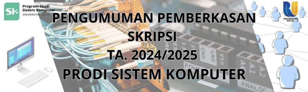 Perhatian! Pendaftaran pemberkasan Skripsi Fast Track Program Studi Sistem Komputer Universitas Royal telah dibuka. Segera persiapkan berkas Anda sesuai dengan persyaratan yang telah ditentukan. Cek jadwal dan prosedur pengumpulan melalui website ini, serta pastikan Anda memenuhi batas waktu yang ditetapkan. Informasi lebih lanjut dapat dilihat pada pengumuman berikut. Apabila terdapat pertanyaan, silakan datang langsung ke kantor Program Studi Sistem Komputer.”
