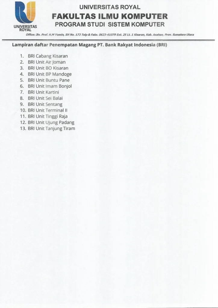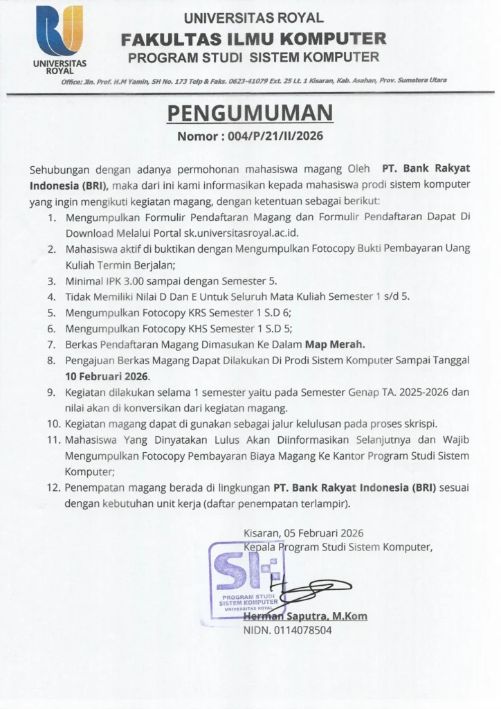 Pendaftaran magang Bank BRI tahun 2026 Program Studi Sistem Komputer telah dibuka. Mahasiswa yang memenuhi persyaratan dapat mendaftar secara langsung di Kantor Program Studi.